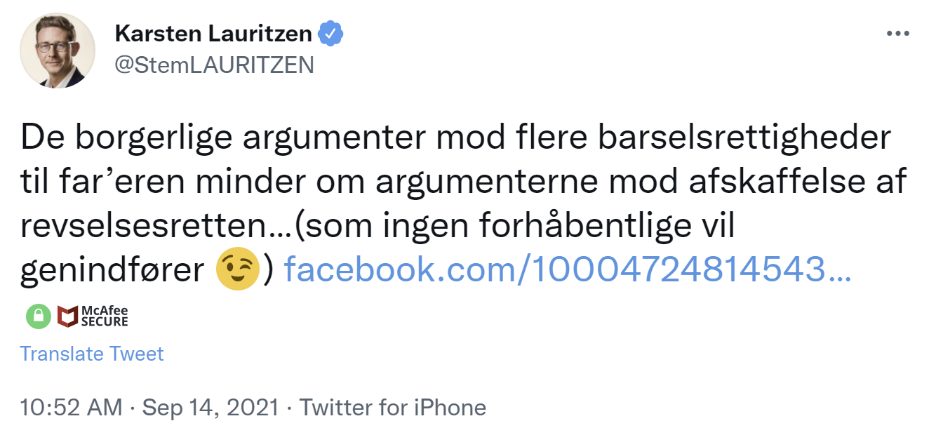 I skrivende stund er det blevet klart, at Venstre – i modsætning til de andre borgerlige partier – støtter det forslag om tvangsfordeling af barsel, som EU og arbejdsmarkedets parter har presset igennem. Karsten Lauritzen sammenlignede endda på Twitter det at være imod tvangsbarsel med at slå sine børn.