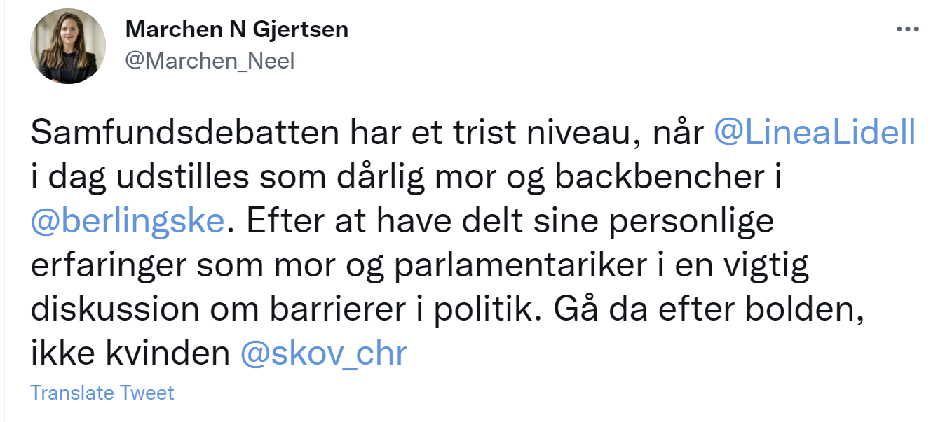 Det angreb jeg. Og det var det, der fik woke-borgerligheden til at træde i karakter. I første omgang var det Marchen Neel Gjertsen, tidligere aktivist i Enhedslisten og nuværende chefredaktør for den borgerligt-liberale avis Jyllands-Posten. Hun valgte en prøvet taktik, nemlig at fordreje mine ord: