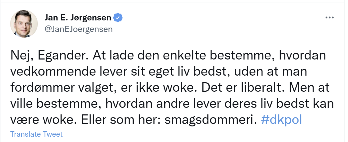 Men andre gange – ofte – indlejres individualismen ikke i forestilling om en forudgiven moralsk orden. Dette kendetegner neoliberalismen. Og derfra er vejen til woke kort. Her er Jan E. Jørgensen et godt eksempel, for han blandede sig naturligvis også i debatten.