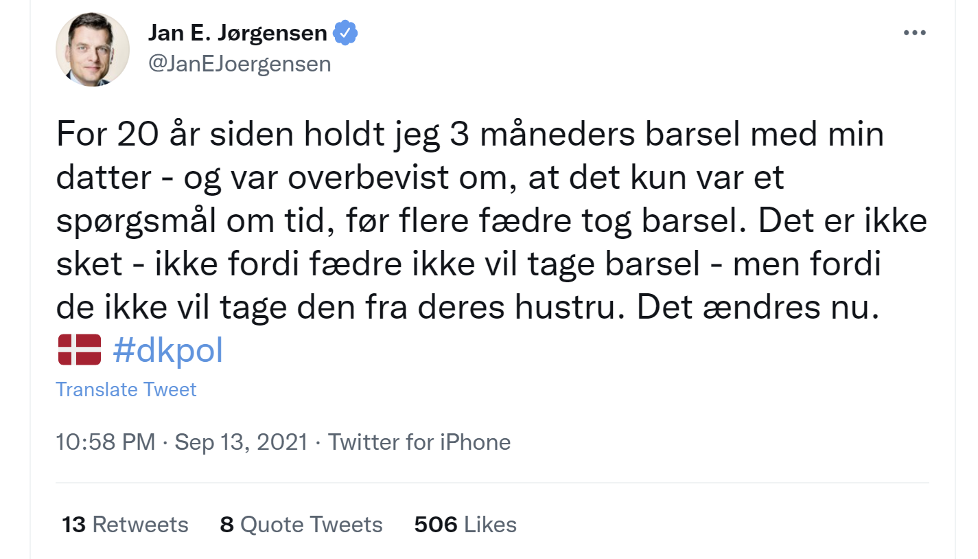 Ja, eller sådan var det i hvert fald i begyndelsen af ugen, for få dage senere ændrede Jan E. Jørgensen helt holdning. Nu havde arbejdsmarkedets parter og EU nemlig besluttet at tvinge mænd på barsel. Da reagerede den ”ægte liberale” sådan: