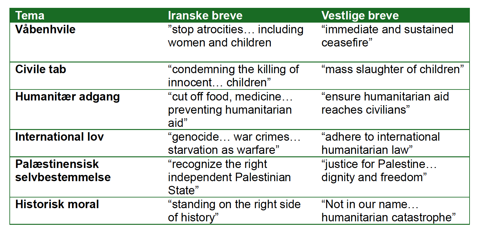 De vestlige breve er indholdsmæssigt identiske med kommunikation fra det iranske regime. Især kravene om en embargo på eksport af våben til Israel er forståeligt set fra regimets standpunkt, eftersom Hamas er en stedfortræder for Iran.
