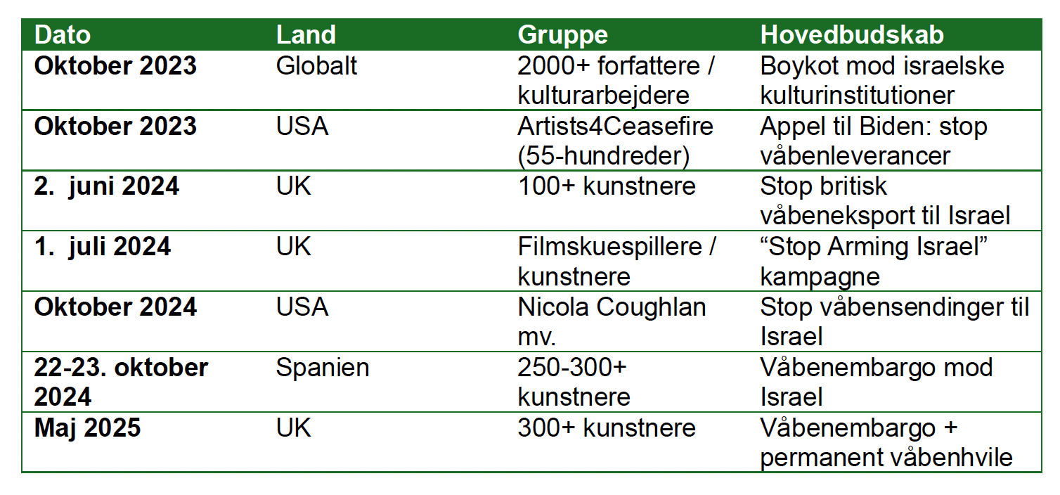 Et hurtigt søg på nettet viser, at der i England er offentliggjort 3 lignende breve i 2024 og 2025. I Spanien og USA har kunstnere også stået sammen som underskrivere. I Norge har både forfatternes og kunstnernes organisationer fremført enslydende krav, dog uden at spørge hvert enkelt medlem først, hvilket har udløst kritik.